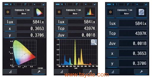 相關(guān)色溫Tcp、與黑體Δuv的差異、XYZ、xy、u'v'、特征波長(zhǎng)λd、色純度Pe、光譜輻射照度、EV、CRI(Ra、Ri)、峰值波長(zhǎng)λp、曝光值 |