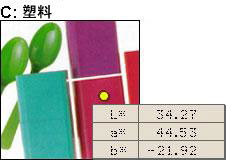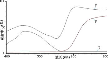 我們測(cè)量一塊紫紅色的塑料部件, 在400nm和700nm左右波長(zhǎng)區(qū)內(nèi)光譜反射率高,而從500到600nm波長(zhǎng)區(qū)內(nèi)光譜反射率低,而且我們可以看到這一波長(zhǎng)區(qū)的光已被吸收。 |