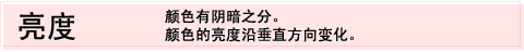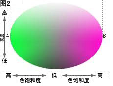 當(dāng)比較各種顏色的亮度(顏色的明亮程度如何)時(shí),顏色就有明亮和深暗之分。 例如,將檸檬的黃色和葡萄柚的黃色來說, 毫無疑問,檸檬的黃色就比較明亮。 把檸檬的黃色和歐洲甜櫻桃的紅色相比, 顯然,也是檸檬黃比較明亮。 可見,顏色亮度的測量與色調(diào)無關(guān)。 現(xiàn)在,讓我們來看一看圖2。圖2是圖1沿A(綠)B(紫紅)直線切開的剖面圖。 可以看出,亮度沿垂直方向變化,越往上去,色彩越明亮,越往下去,則越深暗。