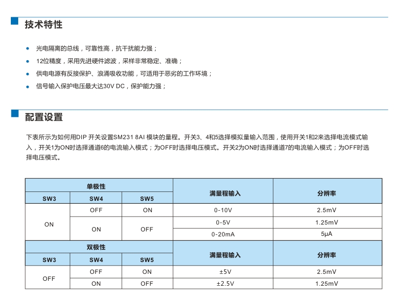 | SM231 | 模擬量電壓輸入模塊,8 點(diǎn),±2.5V,0~10V,0~5V電壓輸入且兩通道可選0~20mA電流輸入,隔離型精度 | CTH2 231-5HF32 |
