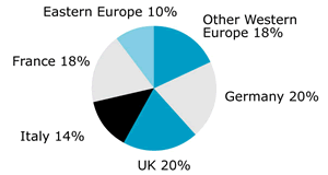 (注:Eastern Europe:東歐,France:法國(guó),Italy:意大利,UK:英國(guó),Germany:德國(guó),Other Western Europe:其他西歐國(guó)家)