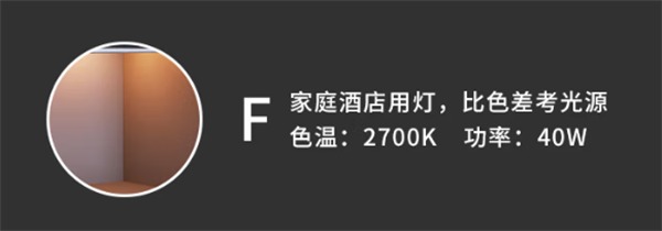 F光源是模擬的夕陽光,其色溫為2700K,是一種黃光源暖色系列、主要用于家庭酒店燈光色,是比/對色參考光源,通常建議燈管型號為GE40WE27。