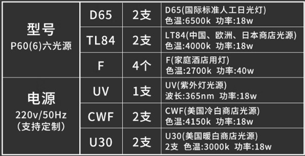 查看市場上的六光源標準光源箱一般配置D65、TL84、CWF、F、UV、U30這六種光源,下圖為三恩時TILO六光源標準光源箱的光源參數(shù)對比。