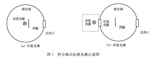 圖1給出了兩種常見的積分球式標準光源(以下簡稱積分球光源)示意圖。積分球光源通常至少由一個積分球和內(nèi)置或外置光源組成。光源通常為鹵鎢燈、發(fā)光二極管光源(tight emitting diode光源,簡稱LED燈)或氬燈。