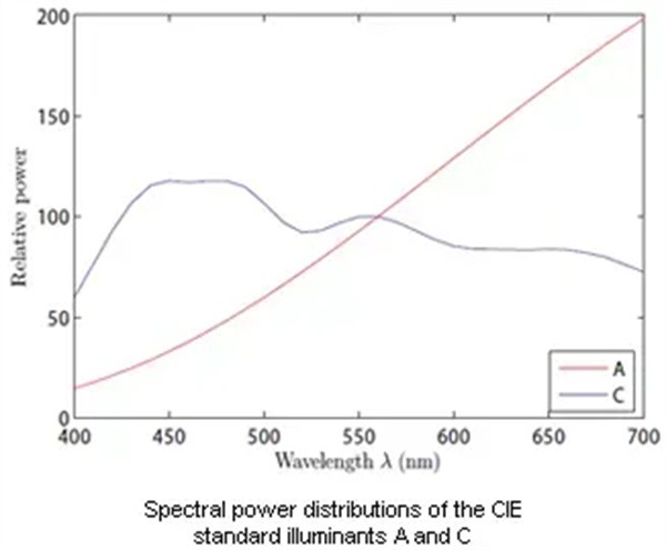 CIE標(biāo)準(zhǔn)光源A與C的光譜功率分布