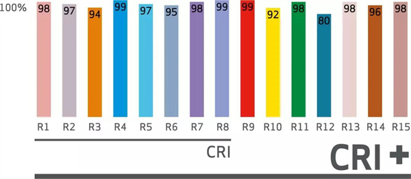 國際照明委員會(huì),將太陽的顯色指數(shù)定義為100,并規(guī)定15個(gè)測(cè)試顏色,R1-R15 分別表示15個(gè)顏色指數(shù),Ra 是指光源對(duì)R1-R8 這八種自然色還原水平的平均值Ra 越大,顯色性能越好。