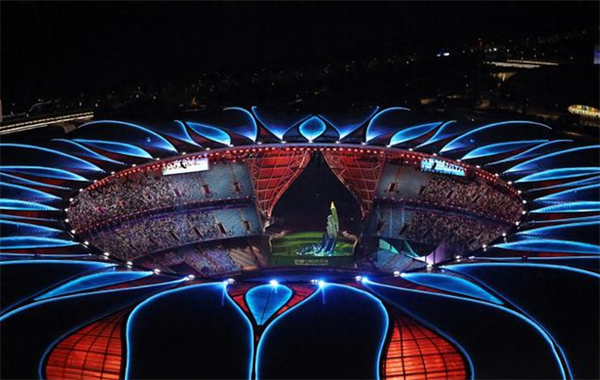 當(dāng)晚,杭州奧體中心體育場(chǎng)“大蓮花”燈火通明,數(shù)以萬計(jì)的發(fā)光二極管嵌入場(chǎng)地,形成了一片數(shù)控草坪,可根據(jù)需要呈現(xiàn)出各種絢麗的圖案,舞蹈演員們化身“露珠少女”,翩翩起舞,宛如盈盈水面的明珠。荷花和桂花在草坪上盛開,給現(xiàn)場(chǎng)添了一抹詩(shī)意。