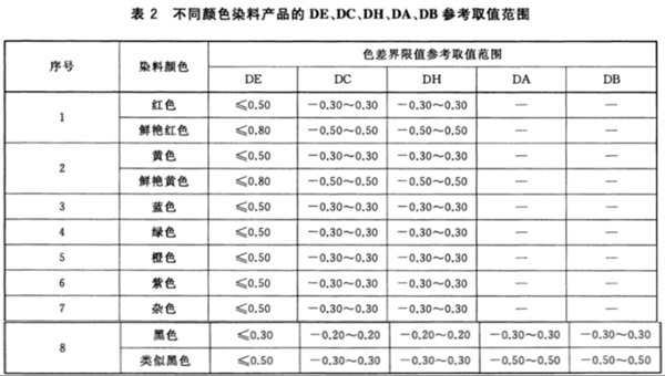 表2給出了不同顏色染料產(chǎn)品的合格的色差分量 DE、DC、DH、DA、DB的參考取值范圍,染料生產(chǎn)企業(yè)和用戶可根據(jù)具體品種的顏色、鮮艷度協(xié)商確定各色差分量及指標(biāo)。