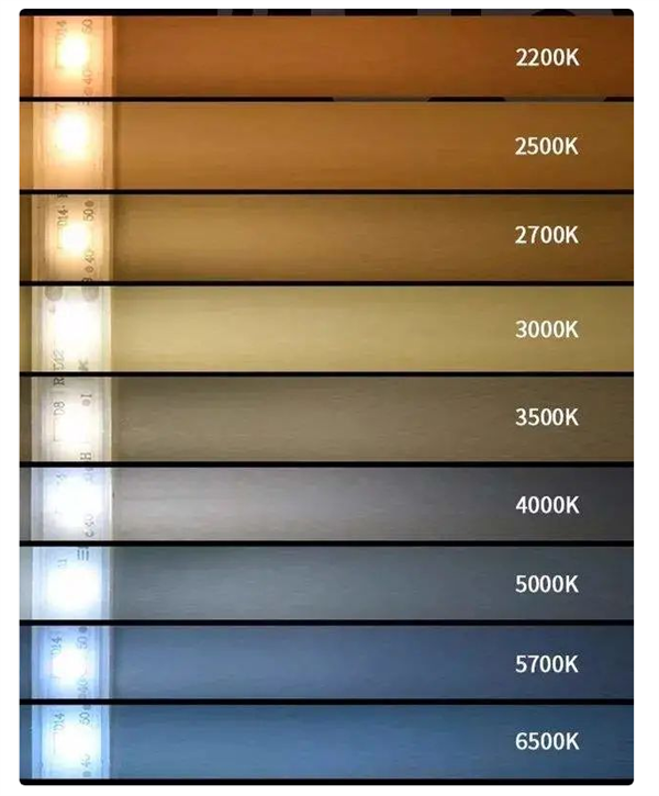 色溫表示光線的冷暖,單位為K(開爾文)。通俗講,色溫數(shù)值越小越偏向黃色暖光,色溫數(shù)值越大越偏向冷光。