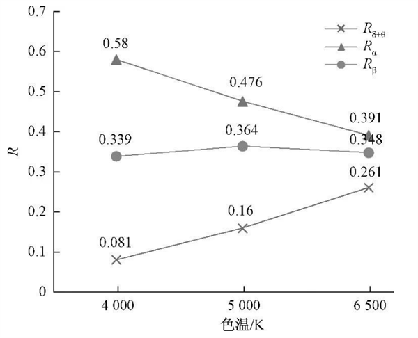試驗結(jié)果顯示,隨著色溫升高,腦疲勞程度逐漸增加,6500 K 色溫引起腦疲勞的程度最高,而4000K 最低; 精神興奮性變化不明顯,總體而言是增加后減小,5000K色溫時,精神興奮性最高,腦疲勞程度適中。