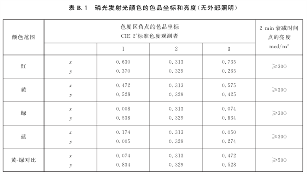 2min±10s的衰減時間點的亮度應符合表B.1的規(guī)定。發(fā)射光顏色應按照圖B.1的關(guān)鍵字用字母來分類。