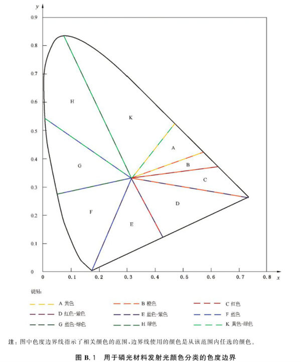 如果按照下面的測試方法測試磷光材料,實測的發(fā)射光顏色的色品坐標應在表B.1中規(guī)定的相關(guān)色度邊界范圍內(nèi),如圖B.1所示。