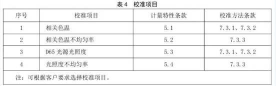標準光源箱校準項目對應本規(guī)范計量特性條款和校準方法條款見表4。