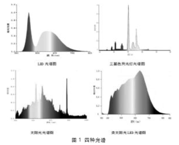 光源中藍光含量過高會對人體生物鐘產(chǎn)生一定干擾。太陽的色溫變化可以代表人類生活的作息規(guī)律,日出時的低色溫到正午的高色溫,再到日落時的低色溫,這是長期以來人類適應的照明環(huán)境。室內(nèi)照明大都在晚上使用,按照人的生活規(guī)律,晚上適應的是低色溫照明環(huán)境,如果長期使用高色溫白光照明,會影響人們的司辰視覺,影響睡眠,生物鐘紊亂,降低人的免疫力,帶來“富藍化”問題。在中性色溫的情況下,LED 光源中的藍光含量高于三基色熒光燈和太陽光中的藍光含量,三基色熒光燈中的藍光含量低于太陽光中的藍光含量。類太陽光LED 中藍光的含量與太陽光中的藍光含量相近,LED 光譜、三基色熒光燈光譜、太陽光光譜、類太陽光LED光譜如圖1所示,