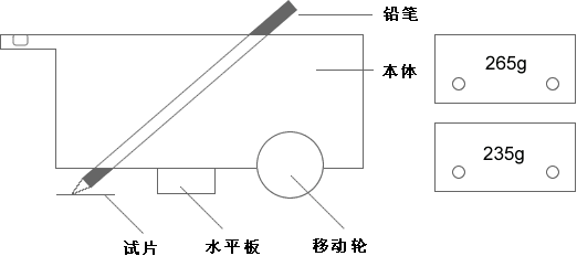 先將試片和儀器置於測試平臺上,選擇硬度適當(dāng)?shù)你U筆,削除鉛筆木質(zhì)部分,使筆芯露出約3mm長將鉛筆芯在砂紙上成45度角研磨平,使鉛筆前端面平坦邊角銳利,此時即可將鉛筆插入45度孔內(nèi)(水平板平放機臺下確保水平),使筆尖著落于試片前端,再用本體側(cè)面螺絲鎖定鉛筆.然后用手推動儀器平行移動約3-6㎝(推速約1.0㎝/s),取下試片將筆尖犁痕擦試干凈.若目視無刮傷痕跡,則再選擇硬一級鉛筆(若有刮痕,則選擇軟一級鉛筆),再試之,依次類推.