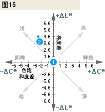 如果我們用文字來(lái)描述色差,盡管用文字不如用數(shù)字來(lái)得精確。 圖15表示某些用來(lái)描述亮度差和色飽和度差的術(shù)語(yǔ);在該圖上表示的術(shù)語(yǔ)指出色差的方向,但如果未附帶使用修飾詞(稍微、十分等),就不指明色差的程度。 從圖上所標(biāo)出的兩個(gè)蘋果的值,我們就可以說蘋果