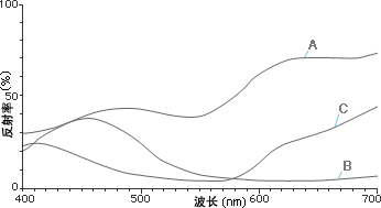 我們測(cè)量一塊紫紅色的塑料部件, 在400nm和700nm左右波長(zhǎng)區(qū)內(nèi)光譜反射率高,而從500到600nm波長(zhǎng)區(qū)內(nèi)光譜反射率低,而且我們可以看到這一波長(zhǎng)區(qū)的光已被吸收。 |