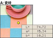我們測(cè)量了一塊粉紅色的瓷磚。 從光譜反射比曲線我們可以看到該瓷磚反射各種波長(zhǎng)的光,以及在600nm(橙色和紅色區(qū))以上波長(zhǎng)區(qū)內(nèi)的光譜反射比要比其他波長(zhǎng)區(qū)的稍高一點(diǎn)。 |