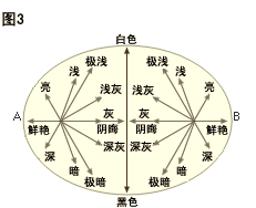 再來說說黃色。檸檬的黃色和梨的黃色相比較又如何? 你可能會(huì)說檸檬的黃色更明亮一些,但除此以外還有一個(gè)大的差別就是檸檬的黃色顯得鮮艷, 而梨的顏色則顯得陰晦。 這種差別稱之為色飽和度或鮮艷度。 從圖2可以看出,紫紅和綠兩色的飽和度分別由中心向兩側(cè)隨水平距離的增加而變化。 離中心越近,色彩越陰晦;離中心越遠(yuǎn),則越鮮艷。 圖3標(biāo)出了一些常用的描述色彩亮度和色飽和度的形容詞。 至于這些形容詞表達(dá)了什么,請?jiān)倏匆幌聢D2。 |