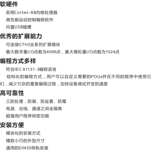 基于高速工業(yè)以太網(wǎng)EtherCAT總線的控制網(wǎng)絡(luò)、符合IEC 61131-3標準的編程方式、內(nèi)嵌強大的單軸/多軸運動控制算法以及可視化的編程軟件,這一切造就了合信新一代集邏輯、運控、視覺于一體的CTH300-C系列運動控制器。而簡易方便的安裝方式、卓越的軟硬件搭配、豐富的擴展模塊種類以及高可靠性,使得CTH300-C系列運動控制器在機器開發(fā)應(yīng)用中無往而不利。