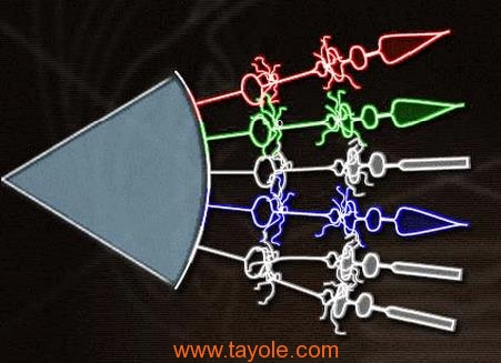 我們能夠看見色彩就是因為我們的眼球中的視網(wǎng)膜上有三種類似錐狀體的負責感受彩色光的錐狀細胞ργβ和類似桿狀體的負責感受明暗的桿狀細胞。其中,負責感紅光的是錐狀細胞ρ,負責感綠光的是γ錐狀細胞,負責感藍光的是β錐狀細胞,他們與桿狀細胞一起構(gòu)成了我們的眼睛對于光的主要接收器。然后通過神經(jīng)傳遞到大腦,形成了我們對于色彩的感覺。所以說我們能看到不同色彩的物體,是因為光照射在色物體上,色物體吸收了部分光波同時又反射了部分光波,反射的這部分光又作用于我們的眼睛,于是這個世界我們看起來就是色彩繽紛的了。