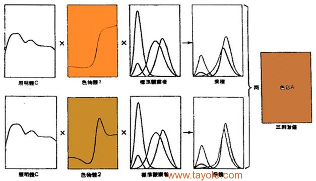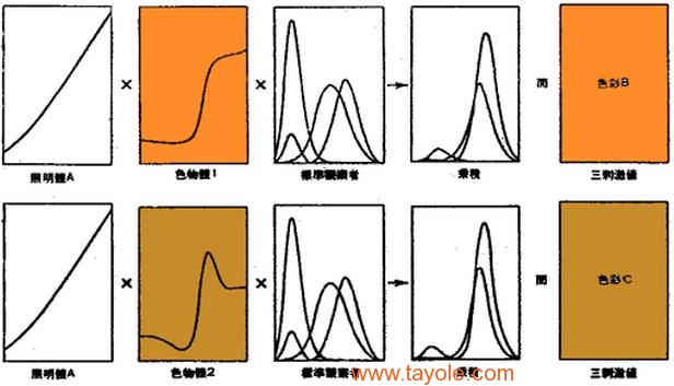 在照明體C下,色物體1和色物體2分別計算出來的XYZ值是不一樣的,也就是對于眼睛視網(wǎng)膜的三刺激值是不一樣的,于是我們大腦就感覺到了這是兩個不同的色彩。這就是為什么會出現(xiàn)不同的色彩在同一個光源下面看起來會是一樣的原因。同樣,如果色物體的光譜是一樣的,在兩個不同的光源的照射下就有可能產(chǎn)生2個不同的三刺激值的結(jié)果,于是這個色彩就會看起來不一樣。