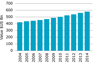 全球包裝市場(chǎng)在2004-2008年期間的年均增長(zhǎng)率為3.5%,而且有望在2014年達(dá)到5970億美元的市場(chǎng)總值。