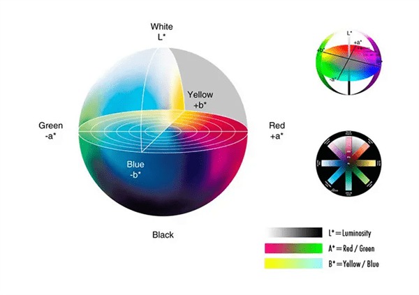實際上,L,A,B是代表物體顏色的色度值,也就是該顏色的色空間坐標(biāo),任何顏色都有唯一的坐標(biāo)值,其中L代表明暗度(黑白),A代表紅綠色,B代表黃藍色,自動比較樣板與被檢品之間的顏色差異,輸出L、a、b三組數(shù)據(jù)和比色后的△E、△L、△a、△b四組色差數(shù)據(jù),△E總色差的大小,△L+表示偏亮,△L-表示偏暗,△a+表示偏紅,△a-表示偏綠△b+表示偏黃,△b-表示偏藍,根據(jù)這幾組色差數(shù)據(jù),根據(jù)CIE (國際照明委員會)對Lab顏色空間的介紹如下:
