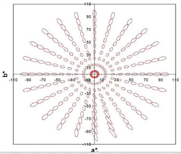 第二,CIELAB顏色空間仍是不均勻的顏色空間,最為先進(jìn)的CIEDE2000也無法做到使得色差值與視覺觀測效果完全一致,故在實(shí)際應(yīng)用中,仍需重新修正。