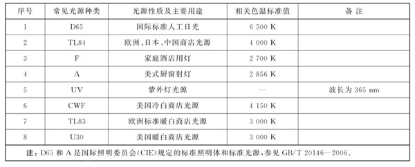 紡織標準光源箱由幾種標準光源同時安裝在一臺標準光源箱內,常用人造的標準光源的用途和相關色溫見表。