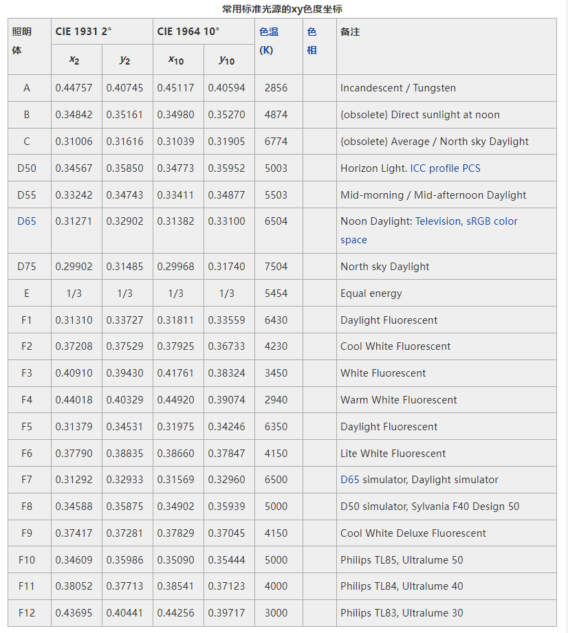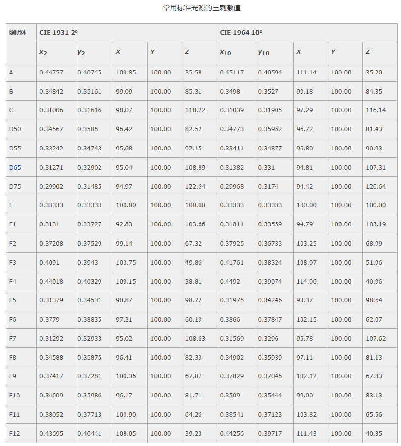 常用的標(biāo)準(zhǔn)光源的主要有六個系列,也就是ABCDEF光源,其中D有4種光源、F有12種光源。本文簡單介紹了這幾種常用標(biāo)準(zhǔn)光源的xy色度坐標(biāo)及三刺激值對照表,僅供參考。