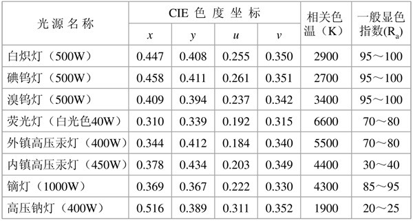 光源材質(zhì)不同,性能也不同。各光源的色度坐標、色溫、顯色指數(shù)對照表如下: