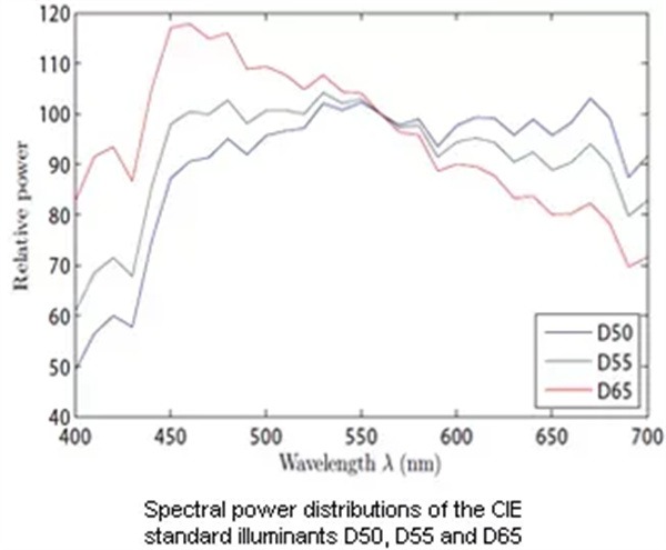 CIE標(biāo)準(zhǔn)光源D50、D55與D65的光譜功率分布