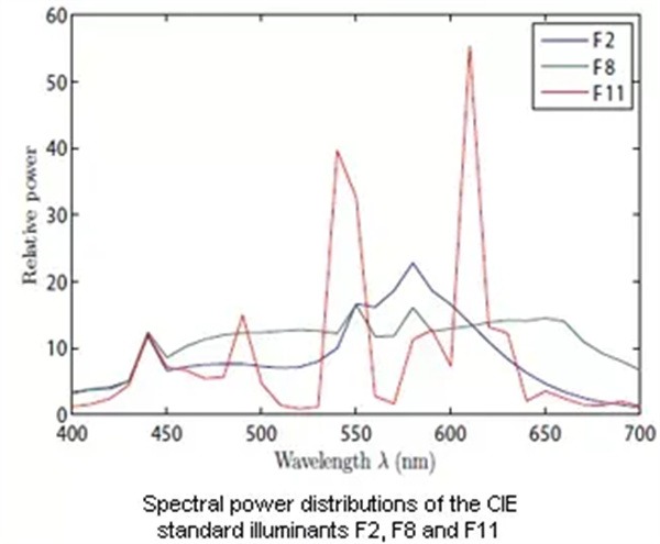 CIE標(biāo)準(zhǔn)光源F2、F8與F11的光譜功率分布