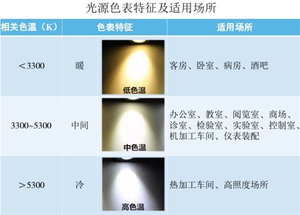 在選擇色溫時,需要考慮心理學、美學問題,但更多取決于照度、室內各表面和家具的顏色、氣候環(huán)境和應用場所條件等因素。通常在低照度場所宜用暖色溫,中等照度用中間色溫,高照度用冷色溫。另外,在溫暖氣候條件下喜歡冷色溫,在寒冷條件下喜歡暖色溫,一般情況下采用中間色溫。