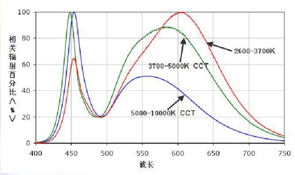一般光源發(fā)出的光是由許多不同波長的輻射組成的復(fù)合光,且各個(gè)波長的輻射功率也不同。我們把光源的光譜輻射功率按波長的分布規(guī)律稱為光譜功率分布。如果光源的輻射光譜中長波段的輻射功率大,該光源的光色就會偏紅;反之,輻射光譜中短波段的輻射功率大,則光源的光色就會偏藍(lán)。