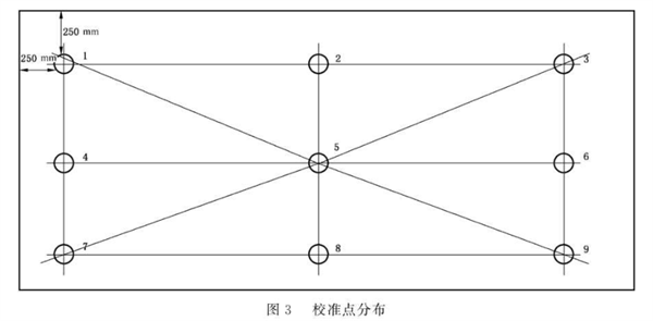 將工作臺(tái)表面均勻選取9個(gè)校準(zhǔn)點(diǎn)位置,校準(zhǔn)點(diǎn)離相近的分級(jí)臺(tái)面邊緣約250 mm,中間校準(zhǔn)點(diǎn)處于各線的交叉點(diǎn)(如圖3)。將照度計(jì)、色溫表傳感器分別平置于工作臺(tái)表面,開(kāi)燈平衡30 min后,依次校準(zhǔn)各點(diǎn)的光照度及相關(guān)色溫,校準(zhǔn)員與傳感器保持足夠距離以避免干擾校準(zhǔn)數(shù)據(jù),待顯示數(shù)值穩(wěn)定后讀取并記錄各點(diǎn)光照度、相關(guān)色溫。按照上述方法重復(fù)校準(zhǔn),共校準(zhǔn)3次,得到3組9個(gè)校準(zhǔn)點(diǎn)的數(shù)據(jù),計(jì)算出的9個(gè)校準(zhǔn)點(diǎn)平均值、最小值和最大值,為校準(zhǔn)結(jié)果。