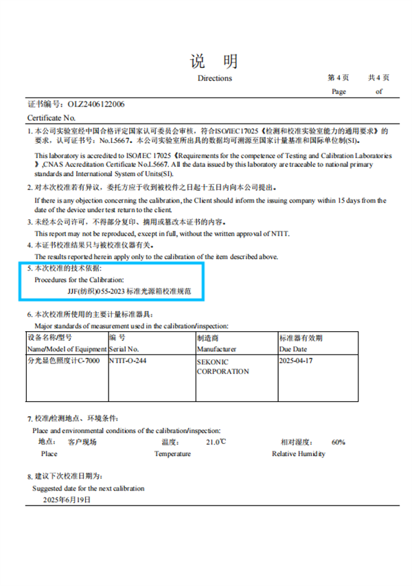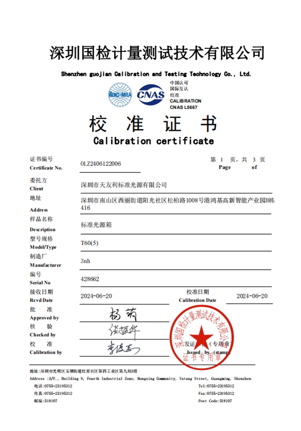 《JJF(紡織)055—2023》新版校準(zhǔn)規(guī)范發(fā)布后,三恩時(shí)送檢了D60(5)、D60(6)、P60(6)、T60(5)等型號(hào)的標(biāo)準(zhǔn)光源箱。經(jīng)檢驗(yàn),均符合要求。我們以T60(5)為例我們以T60(5)為例,認(rèn)識(shí)一下新版的校準(zhǔn)證書(shū)!