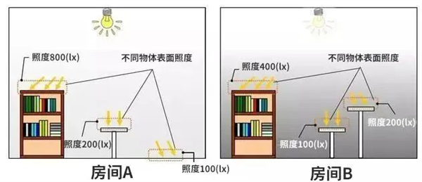 通過(guò)下圖我們可以看出,即使在同一盞燈的照射下,和光源距離不同的表面照度也是不一樣的。