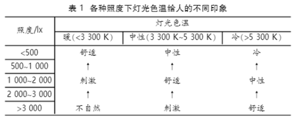 人對光色的愛好與照度水平有相應的關系,表1給出了各種照度水平下不同色溫的照明給人的不同印象。