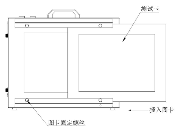 5.調(diào)到所需照度后,預(yù)熱5-10分鐘,待光色穩(wěn)定后,將圖卡插入燈箱卡槽。圖卡在燈箱透射面的正中間,扭4顆緊圖卡固定螺絲將其固定(如圖9)后即可測(cè)試使用。