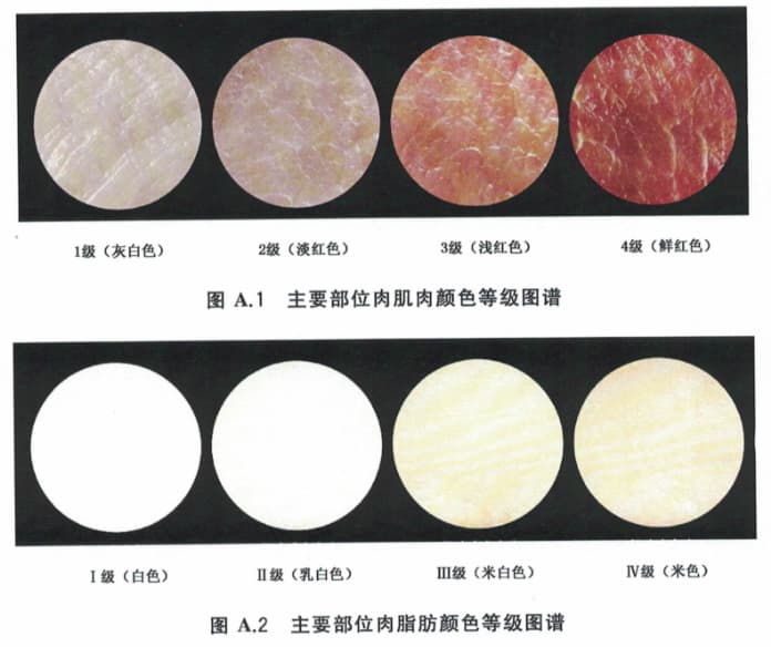 國(guó)家標(biāo)準(zhǔn)《GB/T 42069-2022瘦肉型豬肉質(zhì)量分級(jí)》中對(duì)豬肉主要部位肉肌肉顏色和脂肪顏色等級(jí)圖譜進(jìn)行了明示,具體如下:
